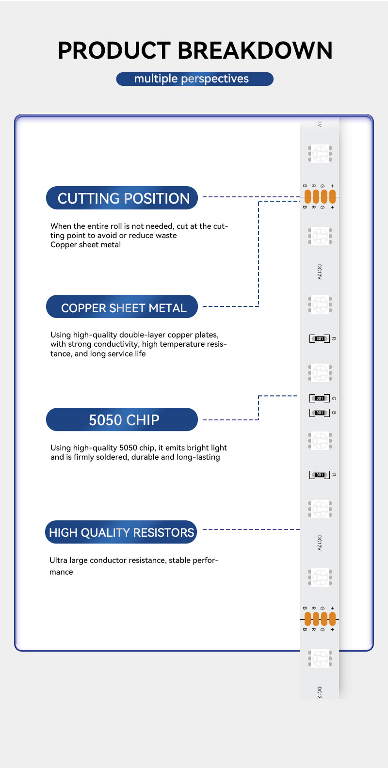 للتركيبات واسعة النطاق ومتطلبات الكابلات لمسافات طويلة، نستخدم تصميمًا بجهد منخفض 24 فولت تيار مستمر. بالمقارنة مع منتجات 12 فولت، يقلل نظام 24 فولت بشكل فعال من فقد التيار وانخفاض الجهد أثناء التركيبات لمسافات طويلة، مما يضمن سطوعًا متجانسًا على امتداد الشريط. لا تعمل لوحة الدوائر المطبوعة النحاسية الملفوفة ذات الطبقتين السميكتين (2 أونصة/3 أونصة اختيارية) على تحسين التوصيل فحسب، بل تضمن أيضًا كفاءة ممتازة في تبديد الحرارة، مما يطيل عمرها الافتراضي إلى أكثر من 50,000 ساعة.