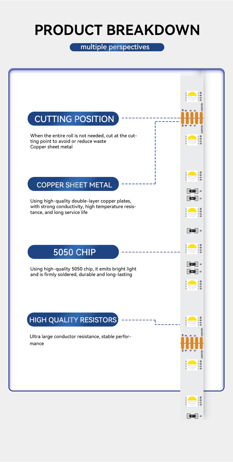 ارتقِ بمشاريع الإضاءة الخاصة بك مع منتجاتنا المتميزة شريط إضاءة LED 5050 RGBW صُممت هذه الشاشة بـ 48 مصباح LED لكل متر، مما يوفر سطوعًا فائقًا وإضاءة سلسة لكل من شاشات العرض الملونة النابضة بالحياة والإضاءة البيضاء عالية الجودة. توفر شريحة RGBW (الأحمر والأخضر والأزرق والأبيض) المدمجة في حزمة صغيرة الحجم 5.0 × 5.0 مم تنوعًا وأداءً لا مثيل لهما.